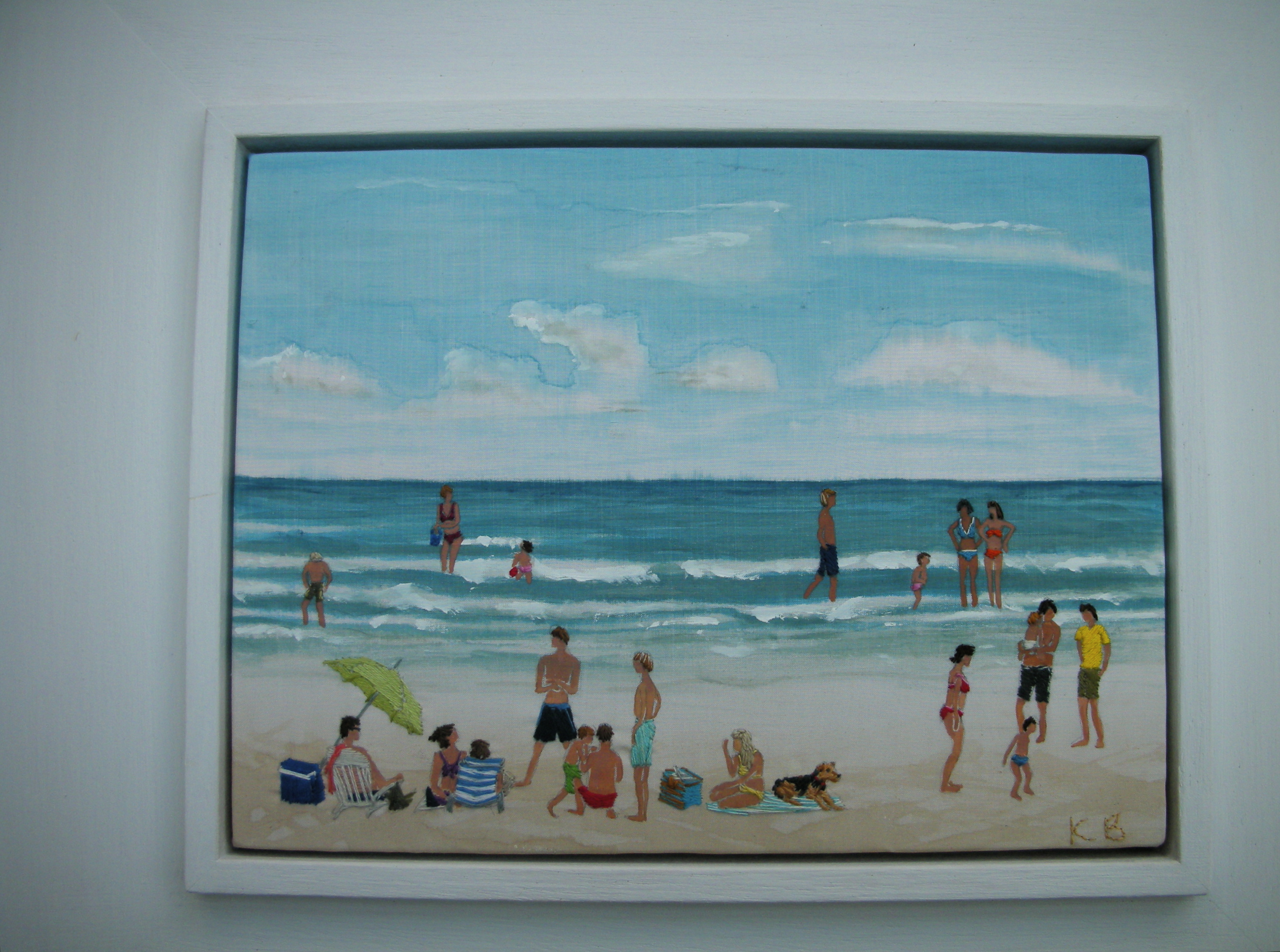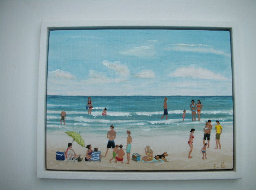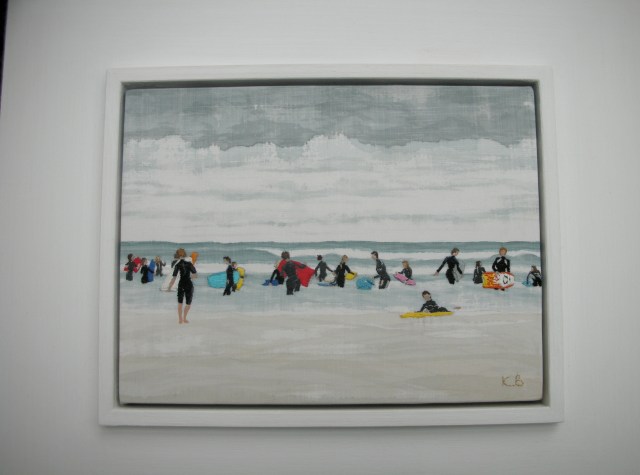 This week Kim secured a second outlet for her painted and embroidered beach scenes, that until now have only been available through Sarah Adams’ Padstow Studio. Henceforth Kim’s work will be showcased at the Fowey River Gallery, a large, two floor space, right in the heart of town, moments from the water’s edge, on Fore Street. It’s a fine gallery, with high ceilings, and plenty of natural light, and lots of work, much of it by local artists. I have a hunch Kim will do well there, for the simple reason that her pictures are so beguiling. Beautifully executed they captivate everyone who takes the time to explore her charming vignettes of Cornish beach life: the paddlers and picnickers, the surfers and sand castle builders, the dog walkers and daydreamers.