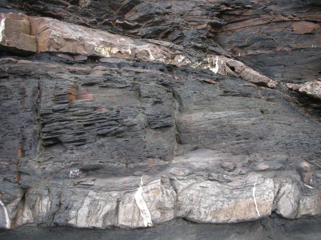 At our feet are countless sandstone pebbles, nearly all criss-crossed with thin white lines, our guide explains are quartz veins created when silica, was forced through fissures in the rocks by heated water at high pressure. The quartz veins are the residue. The small striations caused by tidal water swirling around pebbles.