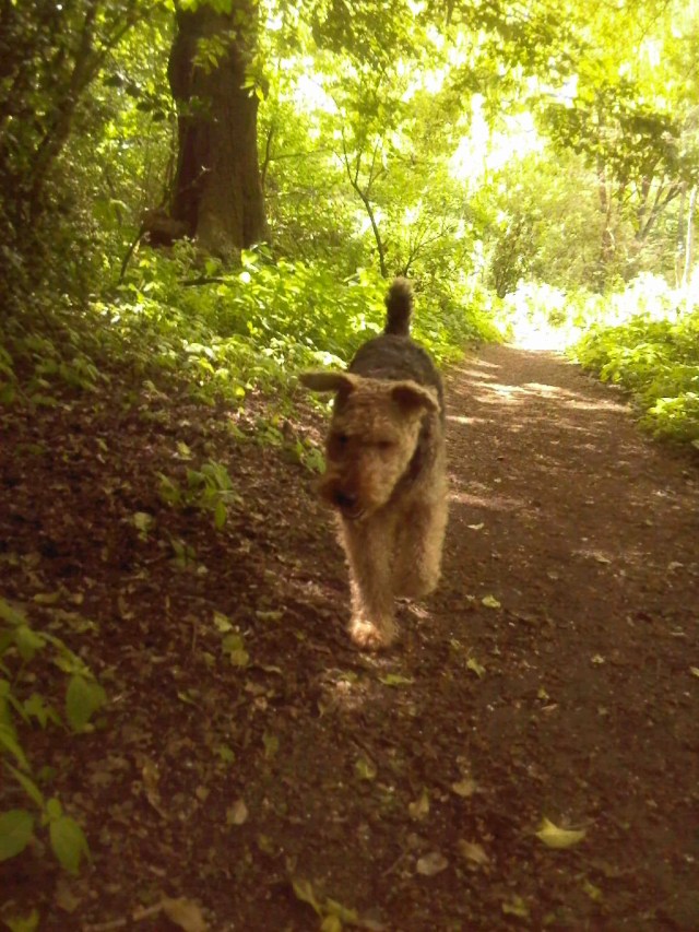 It was on these happy walks that Tashi made the first of many lifelong friends, Carter, a handsome chocolate brown Labrador. Carter took an instant shine to the leggy Airedale and would present Tashi with sticks or chewed up balls whenever they met. If Tashi grew tired of the gang, if ‘something in particular caught her attention’ causing her to leave the pack and wonder off, Carter would bark furiously until she fell back into line.