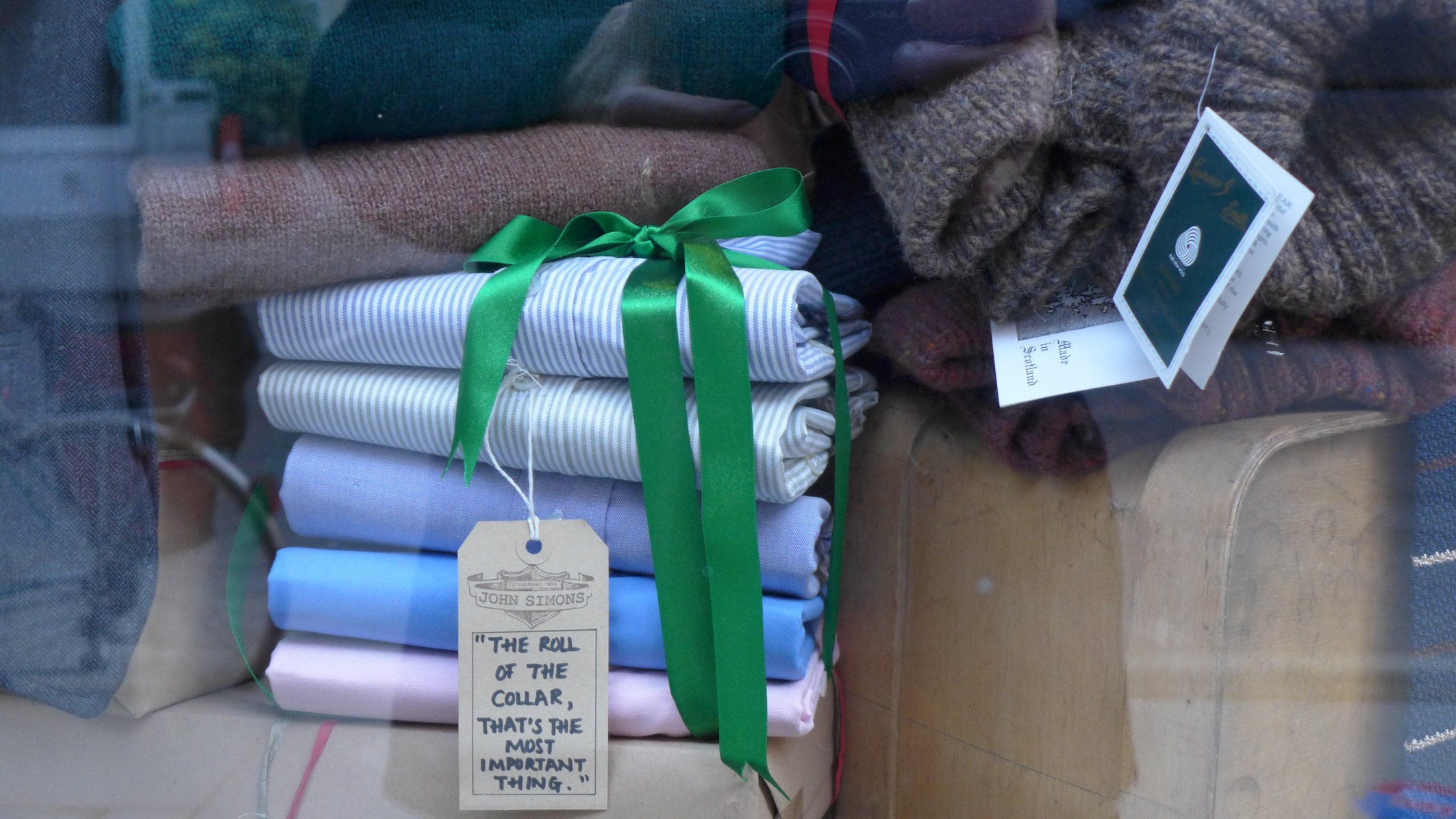 Check shirts and chunky knit sweaters in the shades of a New England fall, and shawl collar cardigans. Brooks Brothers polo shirts, and Baracuta (aka Harrington) jackets, Grenfell raincoats, manly boots by Red Wing and Sebago, and triple welted brogues from Florsheim. And J.Simon’s signature garment, the button Oxford cotton shirt, the backbone of any modern man’s wardrobe. “The roll of the collar, that’s the most important thing,” reads a hand written tag in the window.